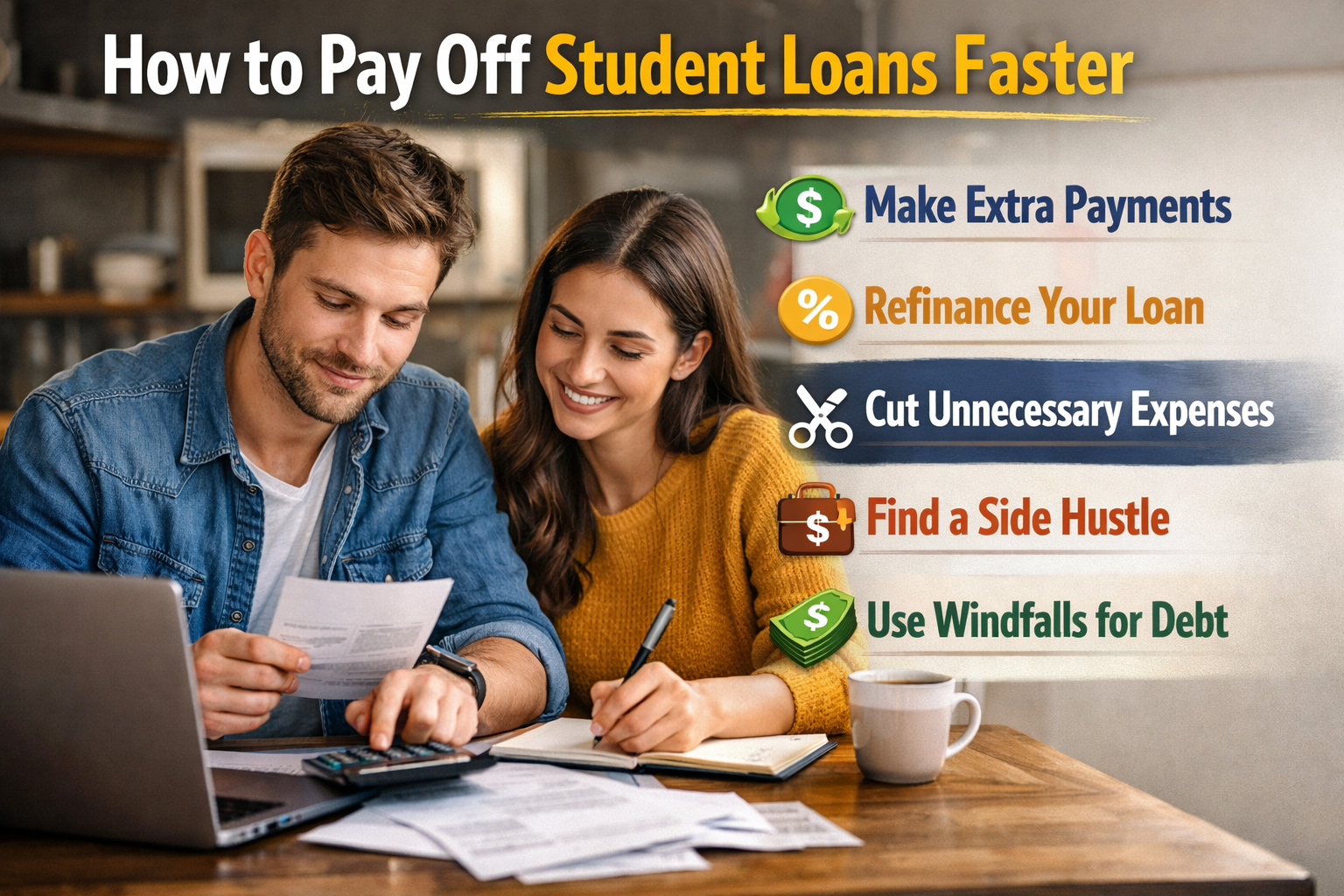 Earning extra income through a part-time job or side hustle can speed up your loan payments. Ideas include: